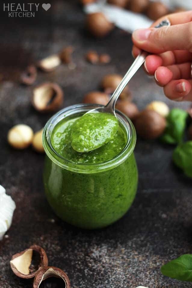 Итальянская кухня Единственный рецепт веганского песто, который вам когда-либо понадобится! Этот вкусный, сырный и полезный вегетарианский соус песто содержит 5 ингредиентов и готовится всего за 5 минут. Подавайте с пастой, хлебом, овощами гриль или картофелем. Всего 209 калорий на порцию! Время приготовления: 5 минут Общее время: 5 минут Сервировки: 8 порций Калорий: 209 ккал Ингредиенты 2 чашки или 140 г свежих листьев базилика 2/3 стакана или 90 г фундука 2 зубчика чеснока 2 столовые ложки пищевых дрожжей 3 столовые ложки оливкового масла 3-4 столовые ложки воды морская соль и свежемолотый черный перец по вкусу Инструкция Добавить листья базилика, орехи, чеснок и пищевые дрожжи в чашку кухонного комбайна или блендера и перемешивать до образования густой пасты, соскребая стороны. Добавьте оливковое масло и воду,