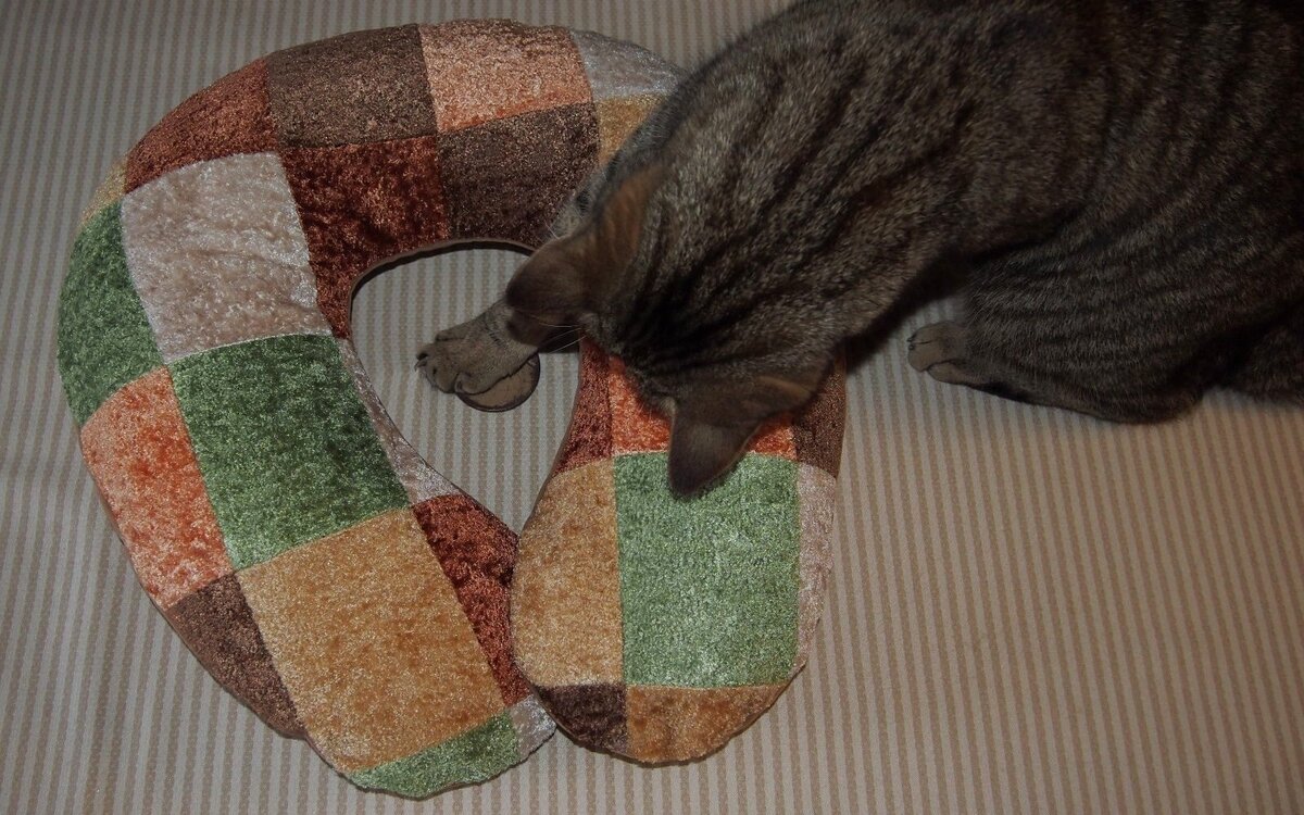 Знакомая моя много ездит в большом автобусе (работа такая). Попросила сшить подушку под шею. Ну, я и решила собрать махонькие кусочки. Образцы обивочной буклированной ткани. Размером 9 х 11 см. И симпатично и польза какая! Выкройку создала, используя лекало Белой Крысы (ссылка в конце). В моём случае клеточка = 6см. Если нужно, делайте скрин и рисуйте свой чертёж. Собрала вот такое полотно (припуски разутюжены, деталь будет на подкладке). И выкроила из него верхнюю половину подушки. Нижнюю половину собрала из лоскутов бархатного флока. Очень приятного на ощупь. Деталь тоже с подкладкой. Вот этого вкладыша. Его я собрала из капюшона от куртки. Капюшон был одинаковый и снаружи и внутри. Поэтому у меня получилось 4 половинки. Линии схематично показывают, как это было. Собрала из деталек две "подковы". Посадила их на синтепон (б.у, отпаренный; ссылка в конце). Ну дальше - всё как обычно. Молния получилась у меня низковато, так позволили флоковые куски. Но застёжка работает хорошо, не смо
