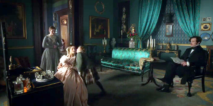 Несмотря на то, что викторианская эпоха имеет стойкую ассоциацию с рукодельничающими барышнями, где вышивка занимает чуть ли не главенствующее положение, в сериале о самой королеве Виктории эта самая вышивка весьма редкий гость. Хотя доподлинно известно, что и сама королева между делами управленческими уделяла вышивке внимание. В третьем сезоне сериала, как и в первых двух (об этих вышивальных эпизодах читать тут >>>) обошлись без видов Виктории с вышивкой в руках, оставив право на рукоделие за родственниками. Семейная идиллия. Юный принц Берти (будущий король Эдуард VII) приветствует мамА и папА. ПапА занят чтением новостей с континента и активно обсуждает происходящую в очередной раз во Франции смену власти в пользу Республики. Сложно заподозрить в пристрастии к вышивке самого Альберта, но пяльцы с большим вышитым рисунком лежат на столике рядом. У зрителя есть возможность самим предположить, что это королева недавно отложила вышивку и пересела к туалетному столику. Нэнси С