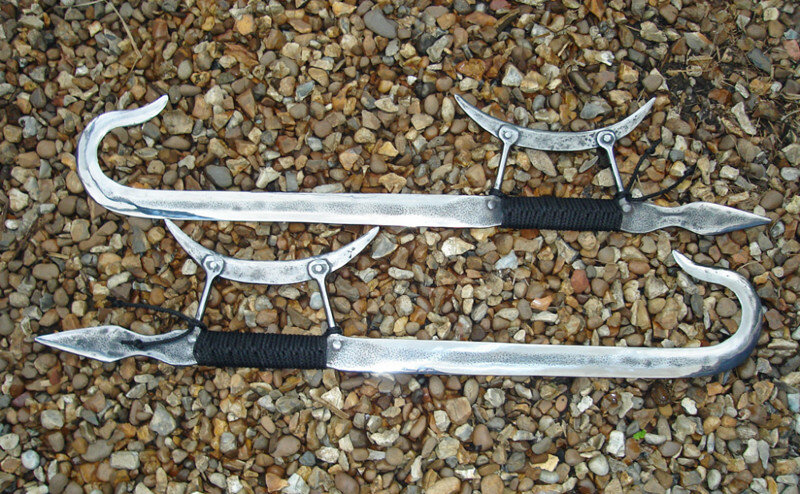 Шуангоу- это меч, с наконечником в виде крюка, с навершием в виде острия кинжала и гардой-серпом. В результате воин, вооруженный таким странным оружием способен был сражаться на разных дистанциях как вплотную, так и в отдалении от противника на расстоянии кончика меча. Затачивалась передняя часть клинка, вогнутая часть «гарды», навершие рукояти и внешняя сторона крюка. Иногда внутренняя сторона крюка не была заточена, что позволяло выполнять хват за эту часть оружия и наносить удары, как топором, той же «месяцевидной гардой». Все это многообразие лезвий позволяло комбинировать приемы, как на дальней дистанции, так и вплотную. Кинжалом рукояти можно бить обратными движениями, серпом — гардой не только резать противника, но и бить по-кастетному. Мысок — крюк меча позволял не только поражать рубящими или режущими движениями, но и цеплять противника, захватывать конечности, подсекать, зажимать и блокировать оружие, а то и вырывать его. Можно было сцепить шуангоу крюками, и, таким образом,