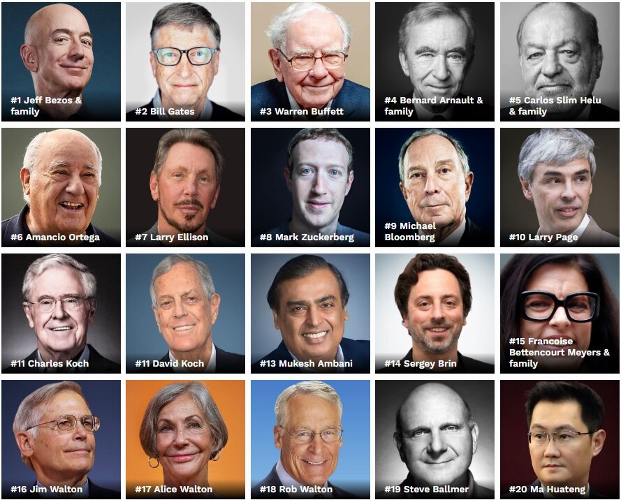 Очередной, 33-й по счету глобальный рейтинг миллиардеров опубликован американским Forbes. Совокупное состояние всех 2153 мировых миллиардеров достигло $8,7 трлн, что на $0,4 трлн меньше, чем в прошлом году. В первую десятку самых богатых людей мира вошли семь американцев, один француз, один мексиканец и один испанец. Следом за Безосом, Гейтсом и Баффетом в списке стоят француз Бернар Арно, состояние которого за год выросло до $76 млрд, и мексиканец Карлос Слим ($64 млрд). В первую десятку богатейших миллиардеров попали также испанец Амансио Ортега ($62,7 млрд) и американцы Ларри Эллисон ($62,5 млрд), Марк Цукерберг ($62,3 млрд), Майкл Блумберг ($55,5 млрд) и Ларри Пейдж ($50,8 млрд). В этом году в рейтинге Forbes 98 российских миллиардеров. По их числу русские на пятом месте после американцев (607), китайцев (324), немцев (114) и индусов (106). В первую сотню рейтинга попали всего восемь русских, самую верхнюю — 32-ю — строчку занимает Леонид Михельсон с $24 млрд. Всеми известный Ро