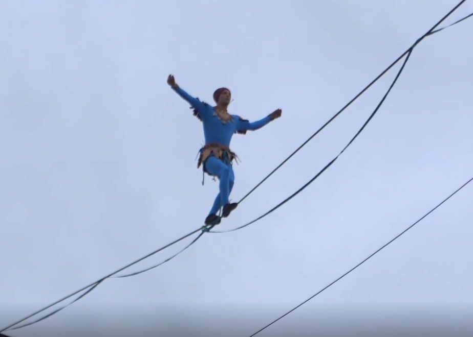 Канатоходец из Германии приехал в Пермь, чтобы пройтись по канату, натянутому на высоте 12-этажного дома.
