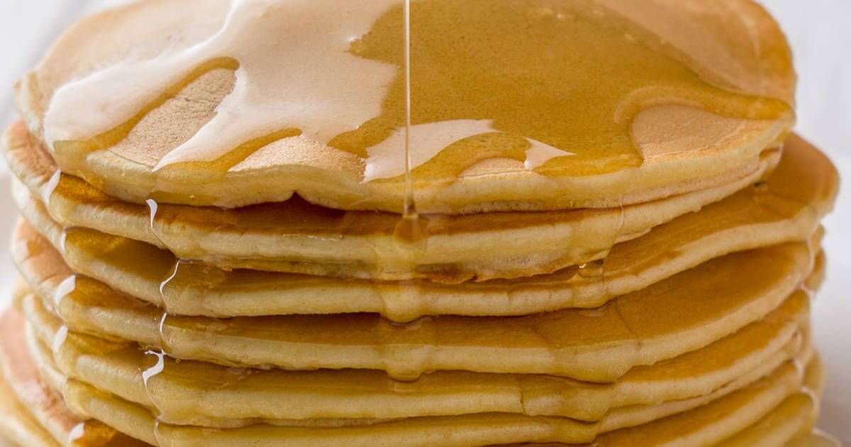 - Складывайте готовые американские блинчики панкейки башенкой на тарелке. Подавайте панкейки на молоке с медом и орехами.