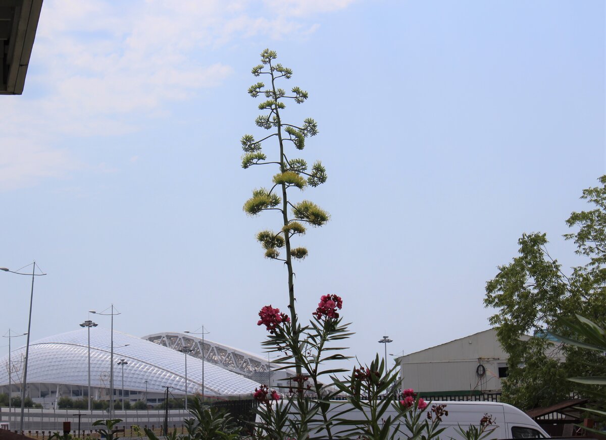 сантиметров , поэтому нужно быть осторожными. Агава -выносливое ,устойчивое к засухе растение, т.к. в сочных листьях содержится много влаги . Не требует частого полива, поэтому легко прижилось в нашем климате. Желающие посмотреть это цветущее растение могут добраться на 60 маршруте до остановки "Формула" . Выйдя из автобуса вы можете увидеть это редкое явление. Поторопитесь, цветение недолговечно!