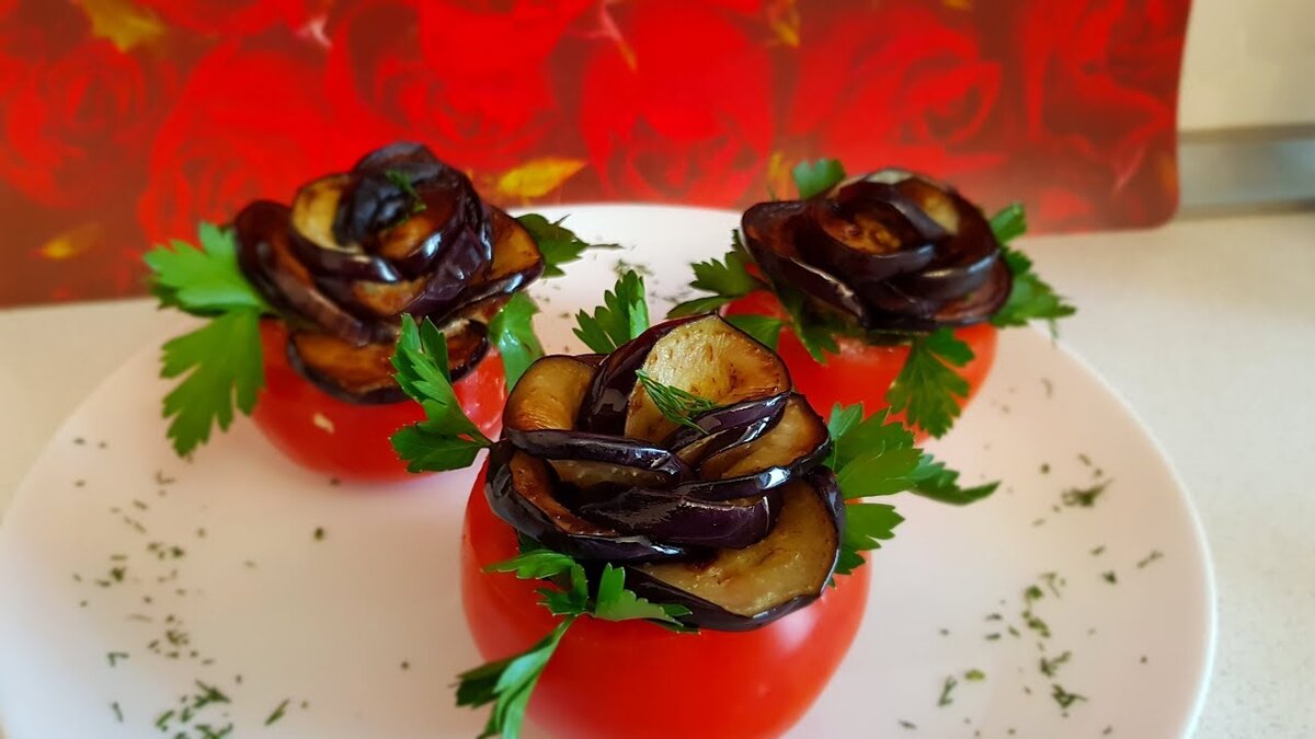 8. Свежая зелень для украшения. Способ приготовления: 1. Баклажаны помыть, обрезать "хвостики", а затем нарезать тонкими кружочками. Посыпать солью и оставить на 15 минут. Через указанное время промыть под водой и обсушить бумажными полотенцами. На разогретую сковороду налить растительное масло и обжарить баклажаны с двух сторон до румяной и золотистой корочки. 2. Сыр необходимо натереть на мелкой терке. К нему измельчить чеснок (пару зубчиков). К сыру так же добавить 70 гр. сметаны. Все хорошенько перемешать. 3. Острым ножом срезать верхушки у помидор. При помощи чайной ложки удалить середину. Затем помидоры наполнить сметанно-сырной начинкой, но не до самого верха. По краям помидоров воткнуть свежую зелень. Из баклажанов сделать цветочек и вставить в середку помидоров. Приятного аппетита!