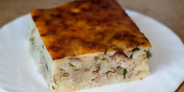 Заливной пирог с курицей Ингредиенты Приготовление Нарежьте лук кубиками и слегка обжарьте на разогретом масле. Выложите в сковороду с луком курицу, нарезанную небольшими кусочками. Готовьте, помешивая, около 10–12 минут. Снимите с огня, добавьте рубленую зелень и соль и перемешайте. Взбейте яйца, добавьте кефир и взбейте ещё раз. Соедините муку, соду, сахар и ½ чайной ложки соли. Всыпьте мучную смесь к жидким ингредиентам и тщательно перемешайте. Влейте в тесто 2 столовые ложки масла и ещё раз перемешайте. Смажьте маслом форму для выпечки и распределите по ней ⅔ теста. Сверху выложите начинку, залейте её оставшимся тестом и разровняйте. Выпекайте пирог около 30 минут при температуре 180 °C. Заливной пирог с яйцами и зелёным луком Ингредиенты Приготовление Сварите 6 яиц вкрутую. Остудите, почистите и нарежьте кубиками. Смешайте их с мелко нарезанным луком, солью, перцем и 1 столовой ложкой сметаны. В миску вбейте 4 яйца и 1 белок. Желток пригодится для смазывания пирога. Добавьте ½