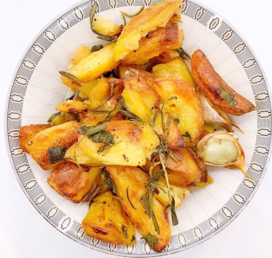 Возможна подача этих блюд по раздельности. Чистим, режем картофель дольками и варим в подсоленной воде около 7 минут Сливаем воду и оставляем картофель в дуршлаге «высохнуть» 3 минуты Трясем картофель в дуршлаге, он должен стать слегка «побитым», чтобы потом получился воздушным Солим/ перчим и запекаем при 190 градусах 30 минут В емкости смешиваем оливковое масло, розмарин, шалфей( по желанию), чуть мнем чеснок и в кожуре добавляем в масло, добавляем чайную ложку винного уксуса и перемешиваем Достаём наш картофель и придавливаем его слегка толкушкой( не пытайтесь раздавить, просто сделайте чуть плоским) Добавляем нашу смесь в картофель, аккуратно распределяем и отправляем назад в духовку до золотистой корочки Лосось нам понадобится: соевый соус, мёд, имбирь и стейк лосося Добавляем все ингредиенты к лососю, хорошо смазываем его и отправляем на 15-20 минут в заранее разогретую до 180-200 градусов духовку На тарелку выкладываем рукколу или другую зелень Перекладываем готовый