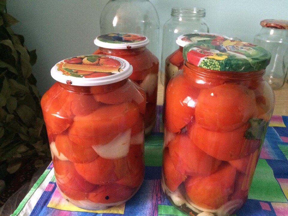 Сейчас во всю идет время консервации, почти каждый день мы закрываем то огурчики, то помидорки. Вот вчера закрыли помидоры дольками, очень вкусный рецепт заготовки на зиму, вот теперь делюсь им и с вами, мои дорогие читатели. Для приготовления рассола на 1 л воды нам потребуется: 3 ст. ложки сахара. 1 ст. ложка соли. 1 ст. ложка 9% уксуса. Итак, перед консервацией нужно заранее подготовить банки, крышки и помидорки. Банки я уже давно не стерилизую, просто хорошо мою ставлю горлышком вниз, чтобы они хорошо отекли и все, можно приступать с консервации. Далее начинаем готовить помидоры: моем и нарезаем пополам. В литровую банку складываем их слоями в перемешку с луком или же с чесноком, это кому что нравится, я закрывала с луком, далее кладем несколько горошек перца и 1 листочку лаврушки, после этого заливаем рассолом. Закатываем банки крышками и ставим стерилизовать на огонь на 10-15 мин. По истечению времени достаем банки и ставим крышками вниз на пол, закрывая сверху бушлатом или тепл
