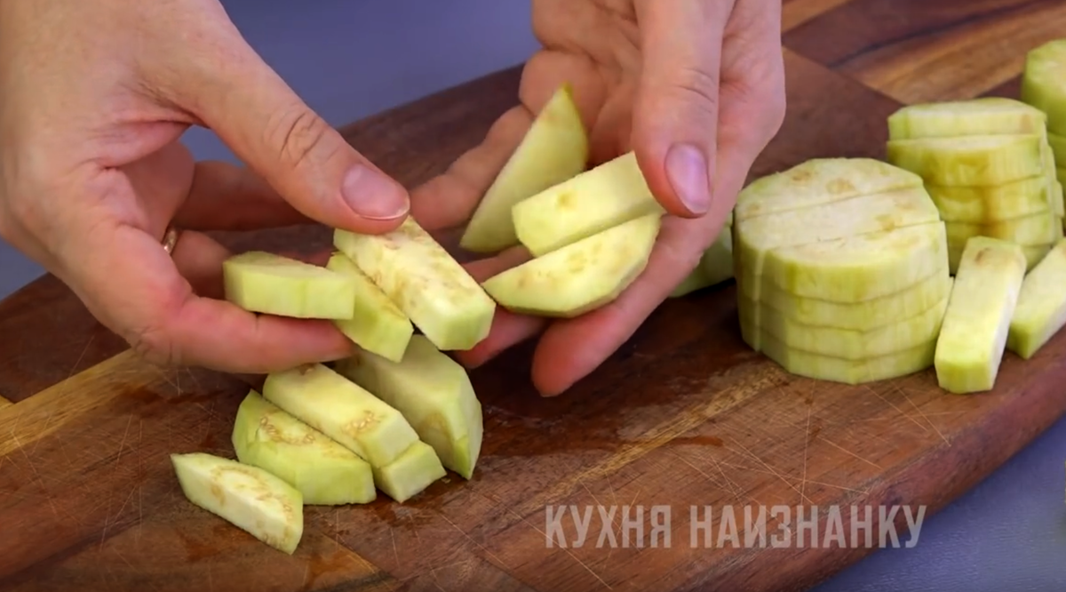 Это мой самый любимый. Баклажаны остаются целенькими и при этом вкусными! Можно кожицу очистить, можно оставить - не важно (как вам больше нравится). Нарезаю баклажаны на удобные кусочки. Я обычно нарезаю по-разному (делаю несколько видов). Для каждого блюда - своя нарезка.