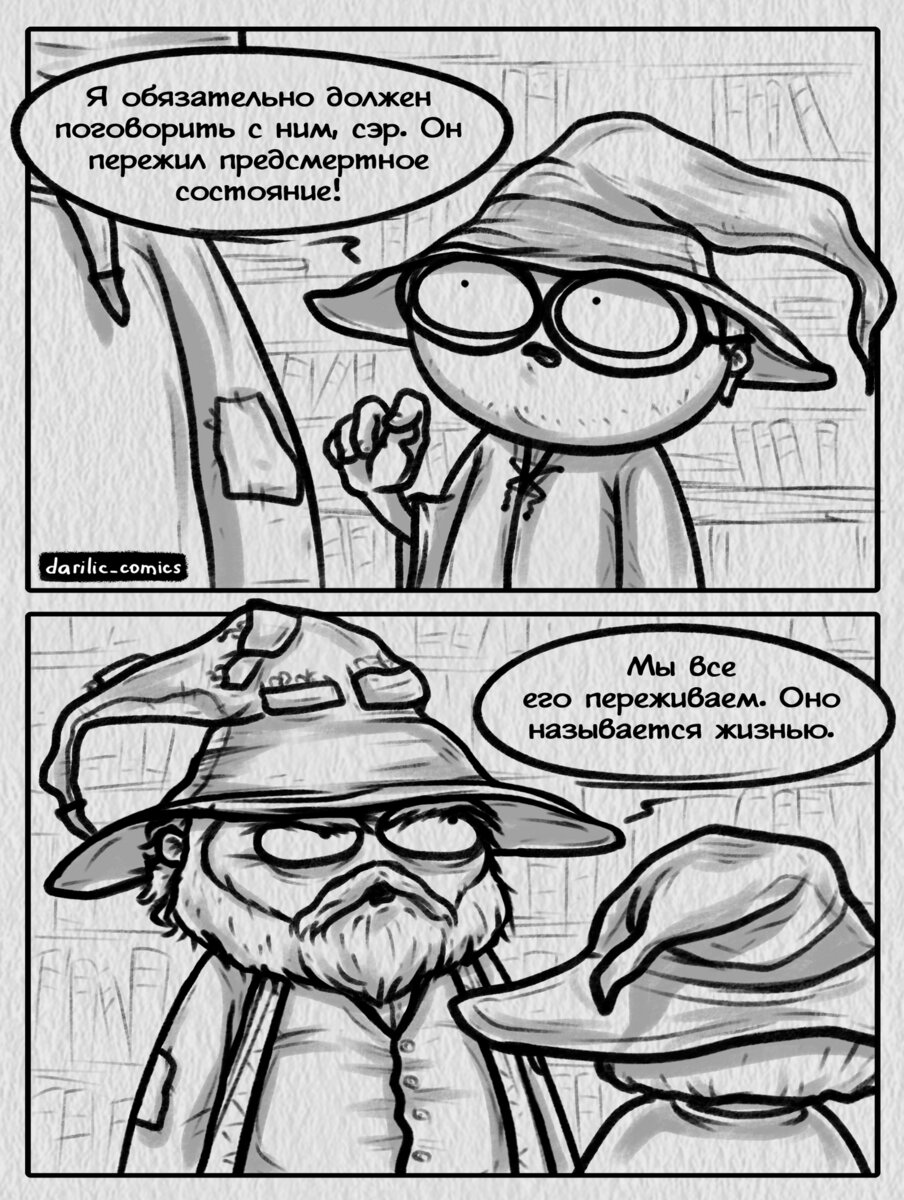 Небольшая энциклопедическая справка: Терри Пратчетт (1948 - 2015) - это известный английский писатель. Наибольшую популярность ему принес цикл сатирического фэнтези про Плоский мир. Цитатам именно из этой выдуманной Вселенной и посвящены многие комиксы художницы darilic. Интересный факт: Дарья настолько серьезно подошла к рисованию «плоскомирных» комиксов, что в начале 2020 года даже связалась с дочерью Терри Пратчетта - Рианной Пратчетт - и попросила разрешения рисовать и выкладывать в открытом доступе комиксы по мотивам книг о Плоском мире. В ответ Рианна поблагодарила за вопрос и сообщила, что в отсутствие коммерческих целей такие комиксы вполне имеют место быть.