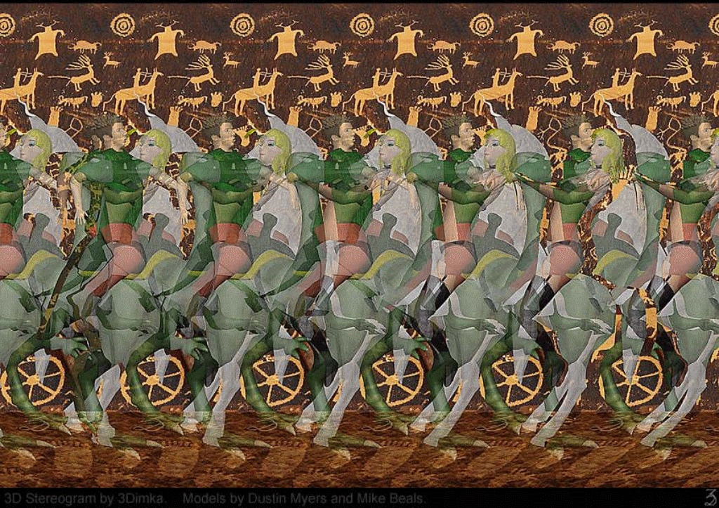Попробуйте очень-очень медленно и плавно перемещать стереограмму от себя - к себе. Цель этих таинственных движений подобрать оптимальное расстояние, при котором двоящийся узор совместится и проявится мутное, нерезкое, но объемное изображение. Вы сами вдруг почувствуете что картинка приобретает объем: сначала фон начнет уплывать назад а затем начнут проявляться размытые формы крупных объектов. Ни на минуту не забывайте, что вам не нужно переводить взгляд на саму стереограмму и ни не нужно концентрировать взгляд.