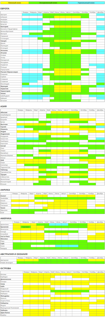 Незалежно від того, чим ви зацікавилися - популярною Туреччиною, недорогим Єгиптом, звичною Іспанією, близькою Хорватією, екзотичними Мальдивами, далекою Домініканою або будь-якою іншою країною, ви зможете відправитися на відпочинок в найкращий час, ідеальний для обраного курорту.