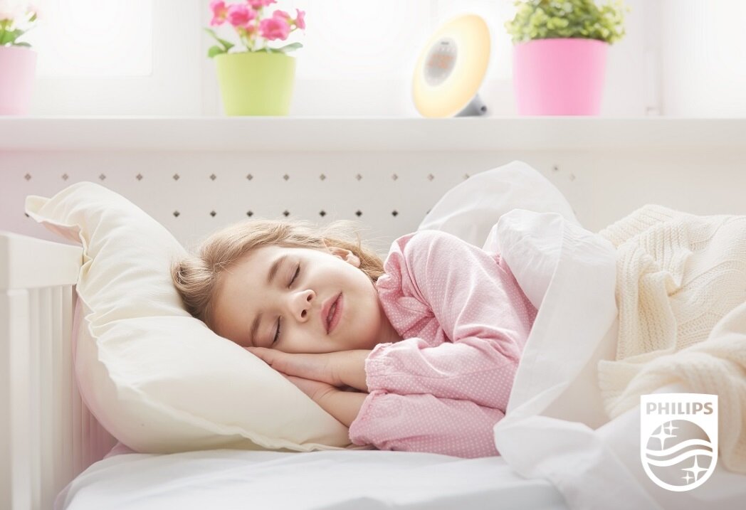 Легко проснуться как взрослому человеку, так и ребенку поможет солнечный свет. Именно он влияет на наши биологические часы: так, перед сном необходимо приглушать освещение в спальне — это позволит организму лучше синтезировать мелатонин («гормон сна»). Комната, в которой спит ребенок, должна постепенно наполняться светом утром. В детской лучше не использовать популярные шторы «блэкаут», потому что в нашей стране солнечного света не так много, и нужно ловить каждый момент. Благодаря плавному нарастанию света организм испытает гораздо меньший стресс от пробуждения. Конечно, осенью и зимой сложно надеяться на то, что утром пробуждение будет совпадать с восходом солнца – сказываются короткие световые дни и облачная погода. Чтобы ребенок легче просыпался, отличный вариант – использовать световые будильники, например, Philips Wake-up light. «Умный» прибор умеет имитировать рассвет и делает пробуждение более приятным. Эффективность световых будильников Philips была клинически доказана в ходе исследований. Так, 92% пользователей согласились с тем, что благодаря имитации естественного восхода солнца вставать по утрам стало намного проще и приятнее.[1] Исследования проводились в том числе и на детях школьного возраста, которые также отметили пользу этих устройств. С помощью такого будильника организм легче «готовится» к новому дню еще до того, как ребенок пошел умываться и завтракать. А в качестве мелодии для пробуждения можно выбрать, например, шум моря или пение птиц – такие спокойные ненавязчивые звуки будут способствовать более спокойному пробуждению.
