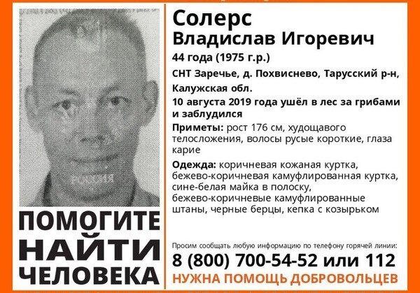 В деревне Похвиснево Тарусского района Калужской области начинаются поиски 44-летнего Владислава Солерса. Требуется помощь добровольцев. 10 августа мужчина ушел в лес за грибами и не вернулся. Калужанин в лесу уже несколько суток. Приметы: рост 176 см, худощавого телосложения, волосы русые короткие, глаза карие. Грибник был одет в коричневую кожаную куртку, бежево-коричневый камуфлированный костюм, сине-белую майку в полоску, черные берцы и кепку с козырьком. Если вы видели Владислава Солерса - позвоните по бесплатным телефонам 8 800 700 54 52 или 112. Источник
