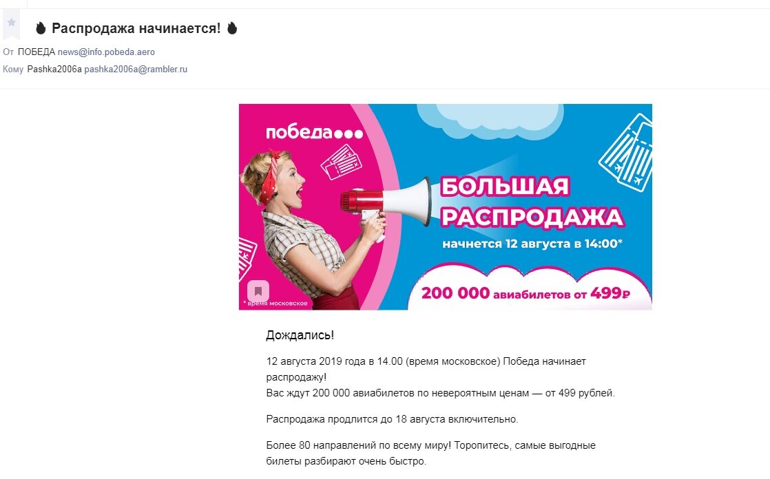 Добрый день друзья! Сегодня я расскажу вам как а/к Победа меня разочаровала. Вообще услугами данной а/к я пользовался только один раз, когда летел в Питер из Калининграда и видимо рассылка с предложениями приходит и даже нечастым клиентам. В одно августовское утро на почту пришло письмо? cодержание которого начиналось "Любой билет 400 рублей, о датах распродажи сообщим позже". Через пару дней приходит письмо в 14. 30 пытаюсь зайти на сайт обновления тоже не помогают Зачем устраивать подобные акции, если сервера а/к не выдерживают такого наплыва посетителей, а если кто-то уже оплатил билеты и в этот т момент сервера встали, т.е. деньги уже от клиента ушли, а на счет а/к не пришли. Вообщем сделал выводы : у а/к не только проблемы с багажами и ручной кладью (провоз данных вещей), но и с серверами. Спасибо что читаете мой канал!