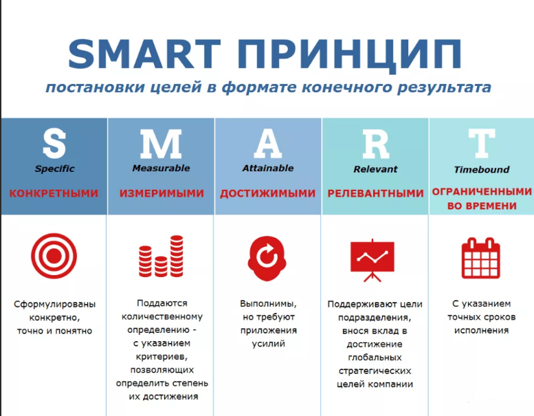 SMART — аббревиатура, которую используют в менеджменте и проектном управлении для определения целей и постановки задач. Смысл состоит в том, чтобы формулировать свою цель в строгом соответствие со smart-критериями, названия которых зашифрованы в каждой букве акронима.