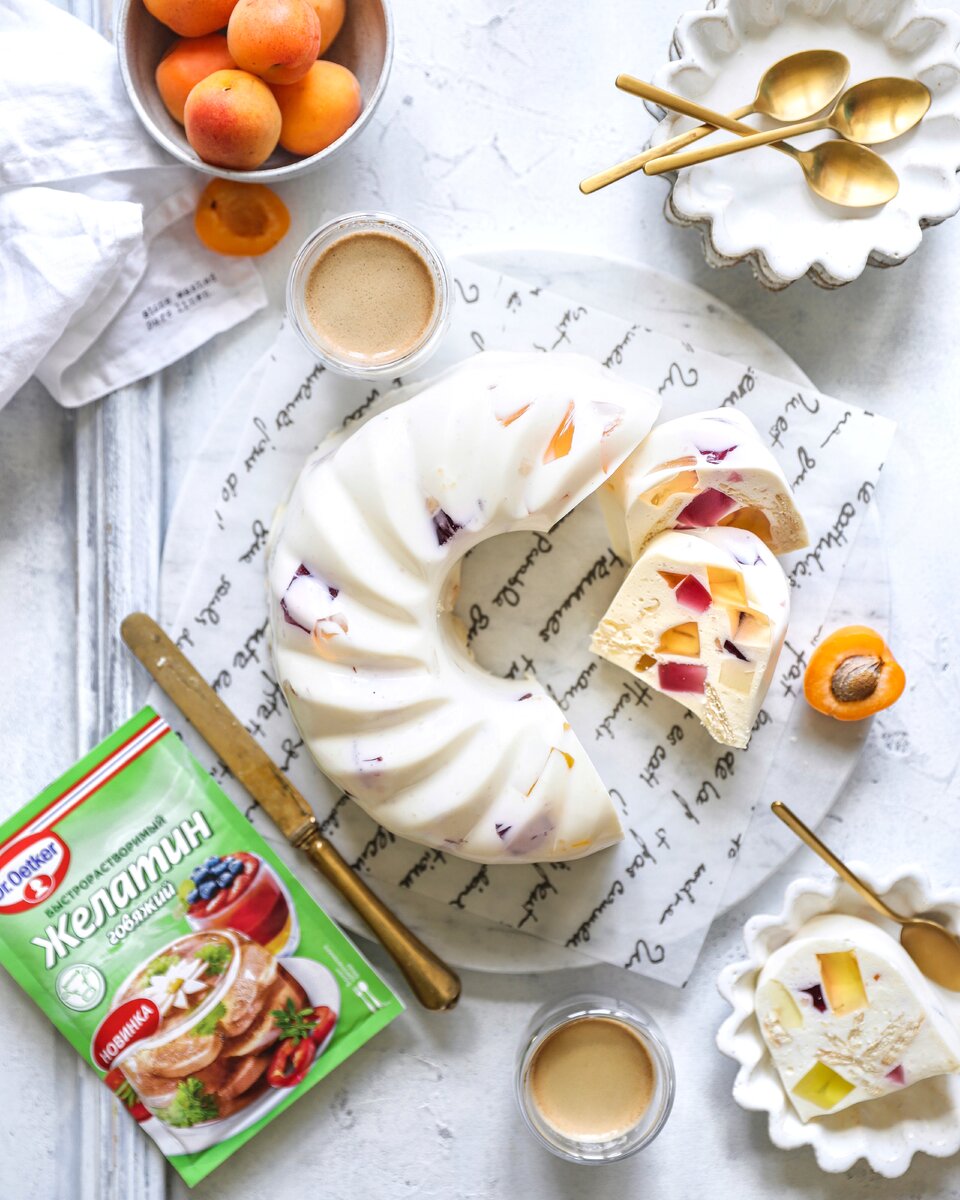 • Желатин Dr.Oetker быстрорастворимый говяжий - 1 упаковка Способ приготовления: ① Готовим желе, следуя инструкции на упаковке: смешиваем 1 пакетик желе с 200 мл воды, хорошо перемешиваем и прогреваем максимум до 60•. ② Остальные желе готовим по такому же принципу. ③ Разливаем желе по формам и отправляем в холодильник на 4 часа. ④ Желатин смешиваем со сливками и хорошо прогреваем, но не кипятим, так, чтобы весь желатин разошёлся. ⑤ Сметану взбиваем с сахарной пудрой. ⑥ Добавляем к сметане сливки с желатином и хорошо перемешиваем. ⑦ Желе извле