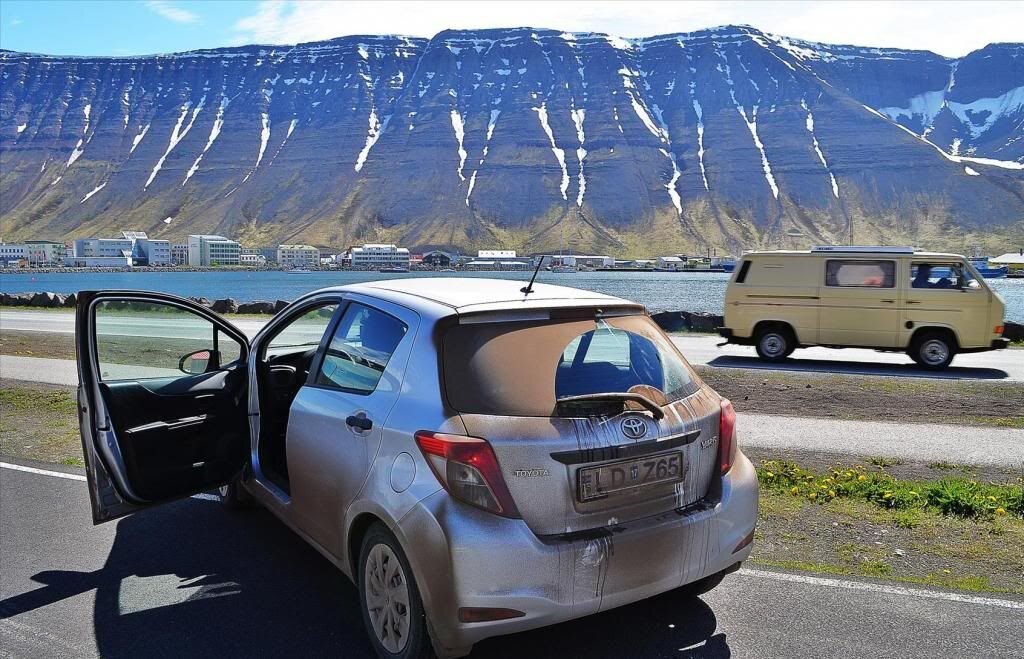 Мы приехали сюда на третий день путешествия, покрыв порядка 500 километров, из которых большая часть была грунтовыми дорогами. То был самый тяжелый день за всю поездку, см. отчет "440 метровая скала Latrabjarg - самая западная точка Европы и миллионы птиц" (ссылка); утром следующего дня выйдя на парковку возле отеля мы увидели во что превратилась машина -
