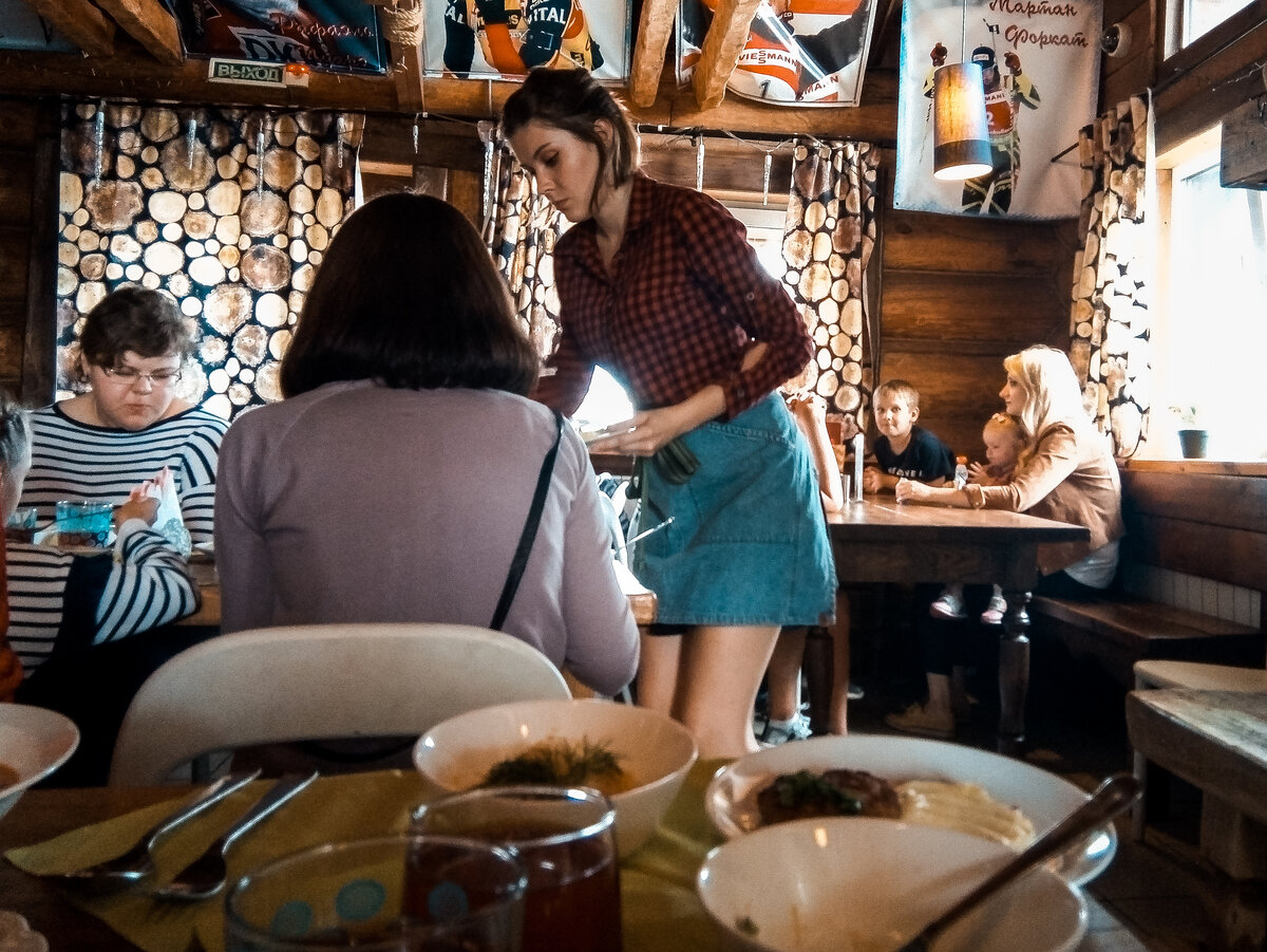В небольших туристических городах интереснее всего бывать в кафе, барах и прочих общепитах. И не только потому что это возможность лишний раз поесть. Еще можно получить изрядную долю издевательств. Вот, например, был я в Гороховце с группой журналистов. Нас привезли на одно интересное событие, а потом повели в кафе. И это не просто кафе, а местная достопримечательность. Хозяин все сделал из дерева, но кое-что не только привлекает, а даже наоборот - отпугивает туристов. Но это на самом деле не самое страшное. Веселье начинается уже внутри, когда вы готовитесь подкрепиться. Или взять сервис. Вот усадили нас за столы, стали приносить еду. А мы все разные, у каждого свои тараканы. Например, одна девушка не ест мясо. И куриный суп есть не будет, о чем и сказала официантке. Пусть лучше кому другому отнесет, чего добро зря переводить. Но логика дала сбой. - Нам сказано всем принести блюда - мы всем и принесем, - отрезала официантка. - А вы сами решайте, есть или не есть. Доводы в пользу того,