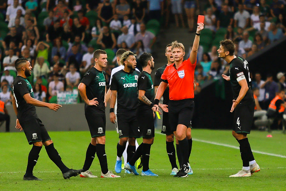 5 тур вчера закончился, а ещё первый игровой день разбираю. В этом туре есть о чём поговорить, но у меня было ДР. Так что сорян. Переходим к матчу. Краснодар принимал на своём поле Рубин, и одна ошибка вратаря решила исход встречи. Также в матче была показана красная карточка (как и во всех играх первого игрового дня пятого тура). Главный судья матча - Сергей Лапочкин. Первый тайм получился очень огненным. На 13 минуте игрок Краснодара Кабелла получает желтую карточку за ударом локтём в воздухе. Затем был первый и единственный гол в матче. Примечательно то, что у Краснодара это единственный удар, судя по статистике, который был направлен в створ ворот. Затем была первая карточка Намли. Вроде особой грубости в его действиях не было, да в мяч он не попал, чем создал своеобразный шлагбаум для игрока Рубина, а атака смотрелась перспективной. Но тут решение на усмотрение судьи, потому что сказать однозначно да или нет нельзя. Затем был удар сзади по ногам от Давиташвили и третья карточка в
