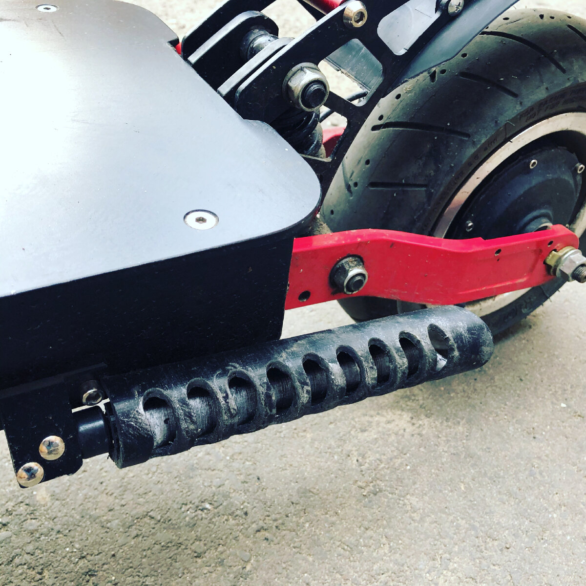 Приобрел электросамокат, штатная подножка оказалась очень короткая и тонкая. Смотрелось откровенно говоря не гармонично. Самокат большой а подножка крохотная. Вот и принято было решение смоделировать и распечатать стильную подножку в виде выхлопной трубы. Немного обработали и покрасили.
