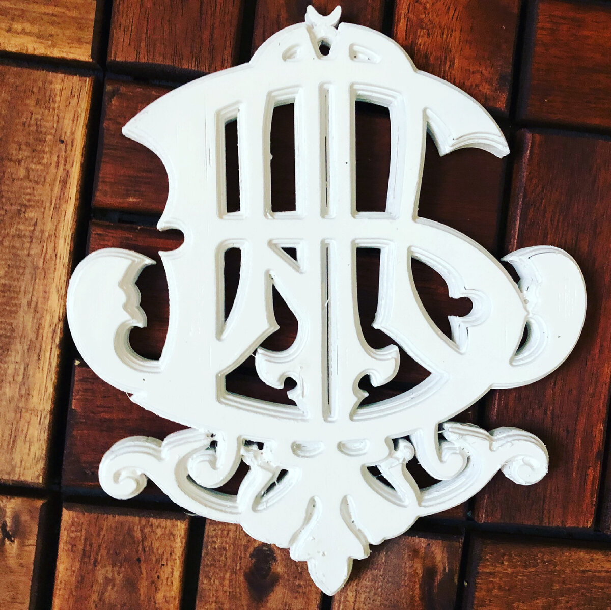 Подобную монограмму раньше вырезали из дерева на ЧПУ фрезере. Мы слелали такую монограмму заказчику именно на 3d Принтере. Это гораздо дешевле и изделие не боится влаги и рассыхания.