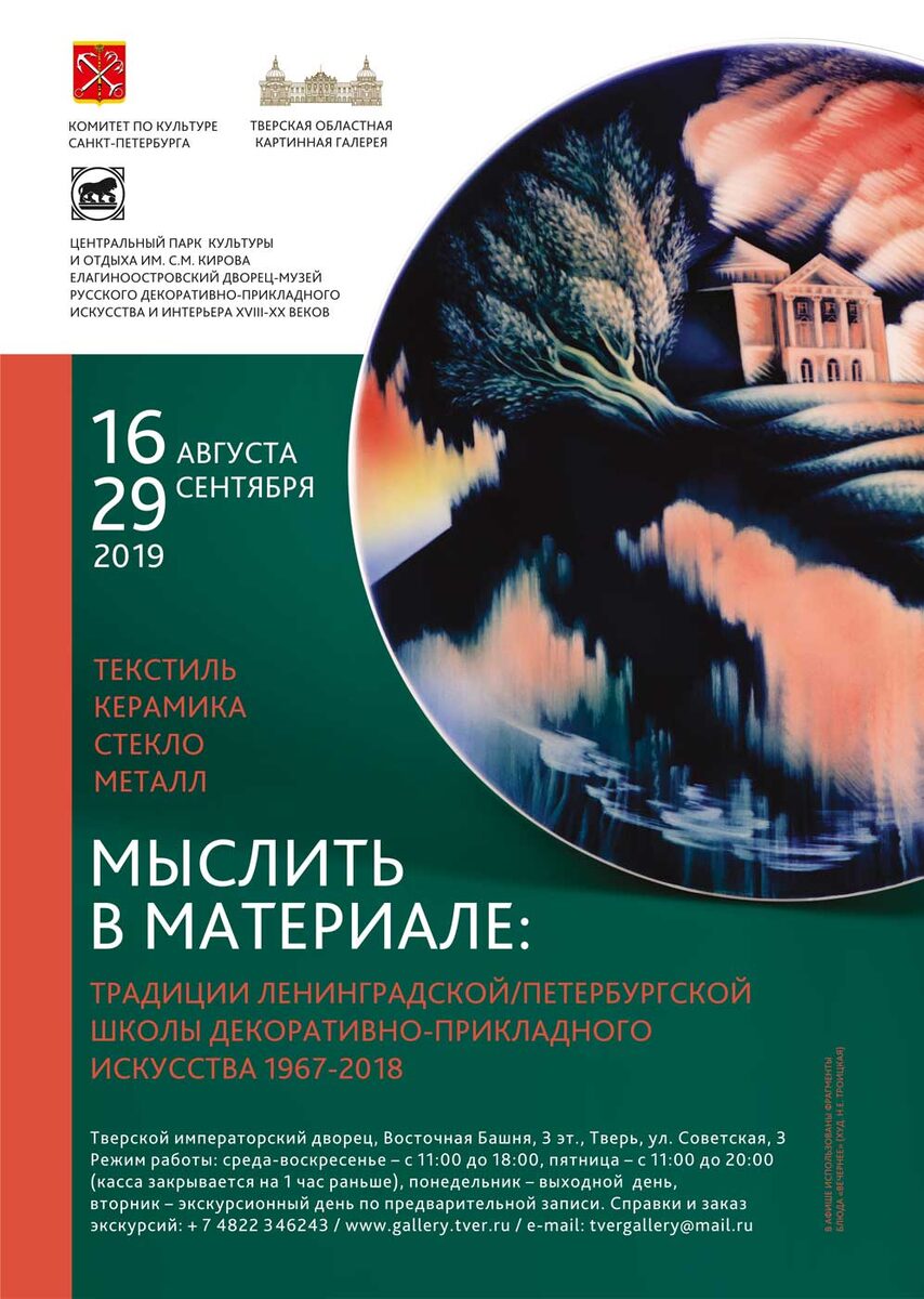 16 августа, с 16:00 в Тверском императорском дворце открывается передвижная выставка из Санкт-Петербурга "Мыслить в материале: текстиль, керамика, стекло, металл. Традиции ленинградской/петербургской школы", которая объединяет работы признанных и молодых мастеров декоративно-прикладного искусства города на Неве. Их имена неизменно ассоциируются с понятием "ленинградской/петербургской школы" как знакового явления отечественной художественной культуры. Экспозиция позволит воссоздать целостную картину петербургского искусства с 1960-х до наших дней. Разнообразие материалов и техник, художественных приемов, новаторских подходов и принципов формообразования удивят даже самого взыскательного зрителя. На выставке представлены предметы из фондов Елагиноостровского дворца-музея, Музея художественного стекла, авторских собраний (г. Санкт-Петербург) – работы таких мастеров, как: Б. Мигаль, А. Кардашев, Л. Голосун, И. Яблочкина, Е. Ткаченко, А. Якуничева, Е. Шнайдер, А. Писарева, В. Гориславцев,