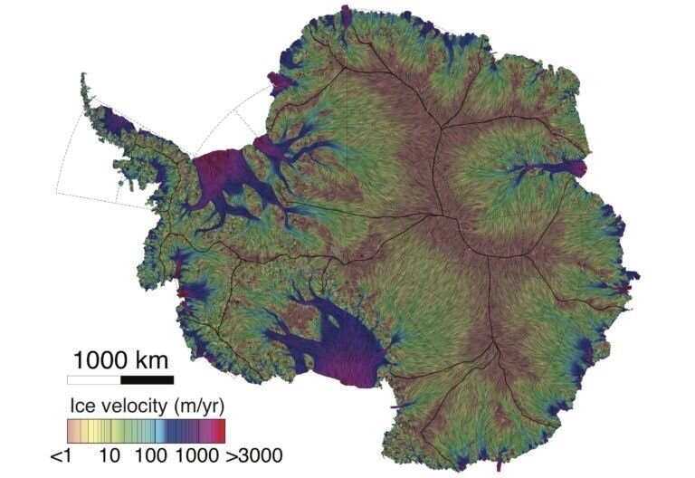 Антарктида — континент, расположенный на самом юге нашей планеты: ее центр совпадает с Южным географическим полюсом. Происходящие там процессы вызывают все больший интерес научного сообщества: это связано в том числе с глобальным потеплением и новыми угрозами. Все мы знаем, что сегодня льды Антарктиды тают быстрее, чем когда-либо за всю историю наблюдений, но у ученых нет достаточного объема информации, чтобы детально прогнозировать этот процесс. Сейчас команда исследователей проанализировала полученные за долгие годы спутниковые данные и разработала точную карту скорости движения Антарктического ледяного щита, что позволит приблизиться к пониманию многих явлений, происходящих на южном континенте. Исследователи из Калифорнийского университета в Ирвайне и Лаборатории реактивного движения NASA объединили данные шести спутниковых миссий Канадского космического агентства, Европейского космического агентства и Японского агентства аэрокосмических исследований за 25 лет. В результаты ученые