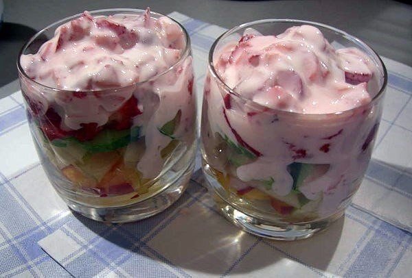 Здравствуйте дорогие мои читатели. Сегодня мы с вами приготовим фруктовый десерт. Что нам потребуется для приготовления? Ингредиенты: Груша — 1 шт мандарин — 1 шт яблоко — 1 шт банан — 1 шт пломбир «Обыденный» — 1 шт печенье «Юбилейное» — 2 шт сметана — 1 ст. ложка сгущёнка — 1 ст. ложка Приготовление: Мелко режем фрукты. Мороженое разминаем и перемешиваем с печеньками, которые мы предварительно разломали на мелкие кусочки. Сметану и сгущёнку перемешиваем. Затем слоями выкладываем в стаканы: яблоко-мороженое банан, мороженое груша, мороженое мандарин. Затем заливаем содержимое стакана смесью сметаны со сгущёнкой. Кладём всё в морозилку на 20 минут. Ну вот и всё готово! Подаём к столу и наслаждаемся.