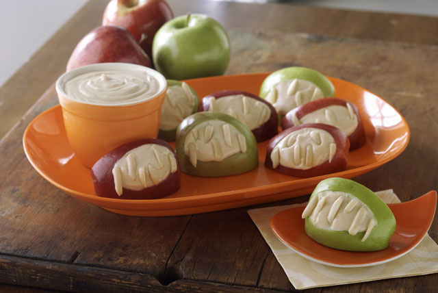 Нарежьте тонким клином кожуру со стороны каждого кусочка яблока; залейте 1 ч. л. сливочно-сырой смеси. Вставьте от 4 до 6 орехов в смесь сливочного сыра в каждом яблоке, чтобы напоминать зубы. 3