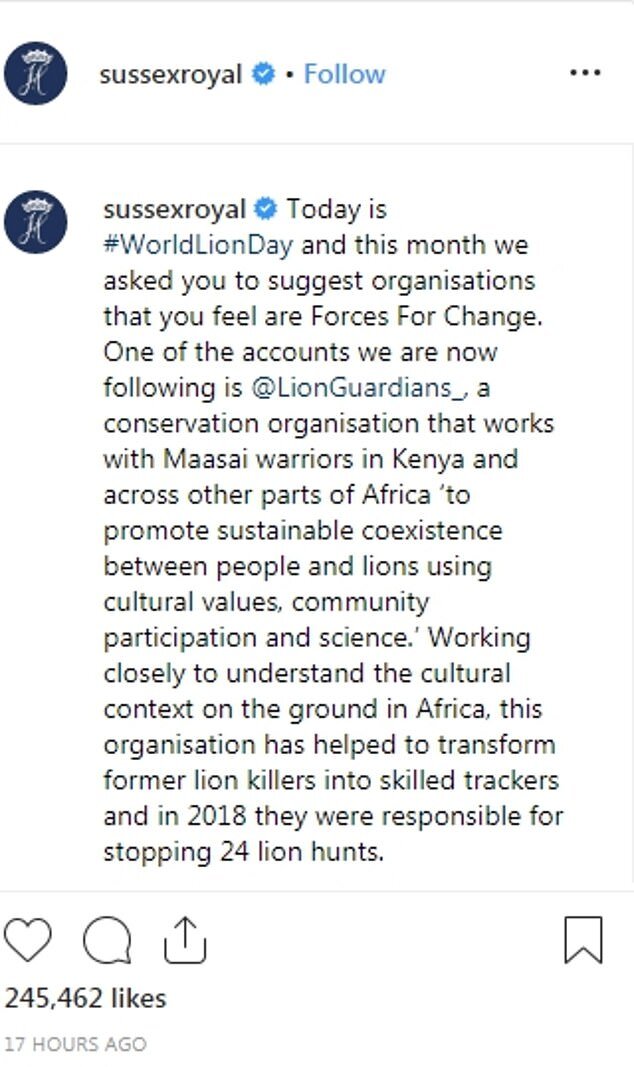 Видимо, именно этим принципом руководствовались Меган Маркл и принц Гарри, размещая на своей страничке в инстаграме пост во Всемирный день льва с призывом к своим фанатам поддержать благотворительную организацию, которая занимается защитой африканских львов.