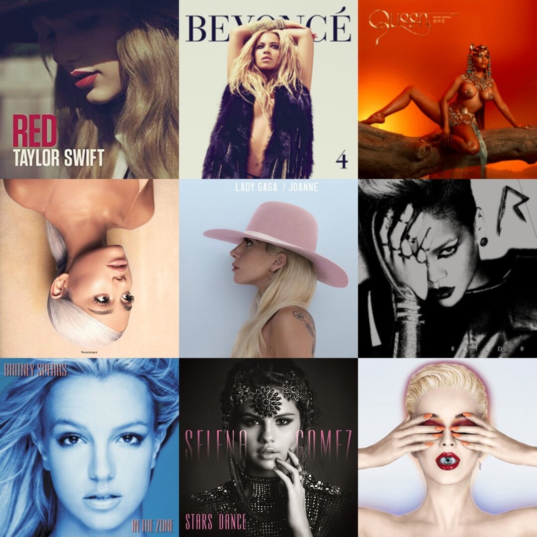 "Red"- 153 "4"- 78 "Queen"- 52 ( еще в чарте) "Queen"- 52 "Joanne"- 49 "Rated R"- 45 "In the Zone"- 45 "Star Danse"- 25 "Witness"- 21 Какой ваш любимый альбом?