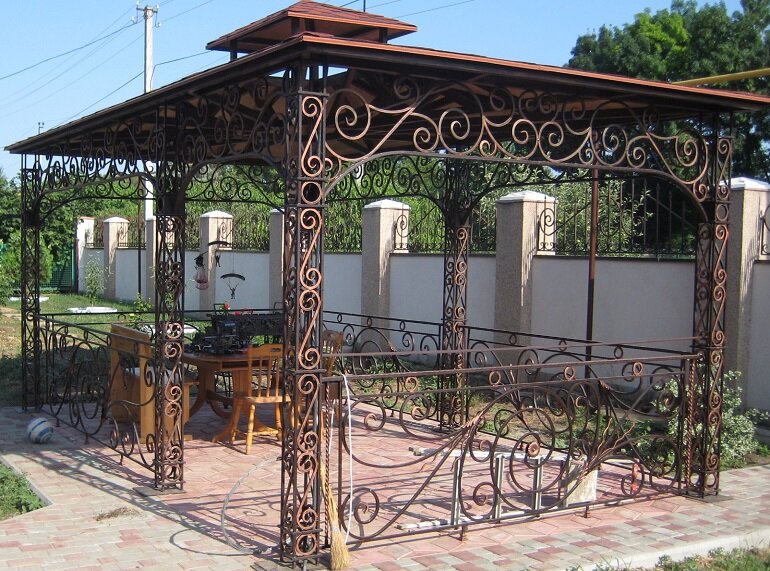 Среди традиционных и современных стройматериалов всегда найдется такой, которому не занимать прочности – железо. Причем из металла беседка получается весьма выразительной, за что надо отдельно благодарить ковку. Кому подойдет Пользователи типовых каркасных и тентовых беседок часто жалуются на усадку древесины и неустойчивость металлопластикового профиля. Если тент можно убрать во время непогоды, то возведенный каркас уже никуда не денется. Он обременяет всеми капризами лесного массива. Спрашивается, зачем каждое лето проверять состояние древесины, если можно заранее сделать выбор в пользу беседки из металла (углеродистая или легированная сталь, бронза, сплав)? Между прочим, соответствующую конструкцию приветствуют: Поэтому при выборе тематического сооружения надо понимать, что оно подходит только для летнего пользования и хорошо сочетается с другими железными изделиями – кованый мост через ручей, столбчатые фонари и т.п. Кованая беседка не обходится без узоров в виде цветков и виноград