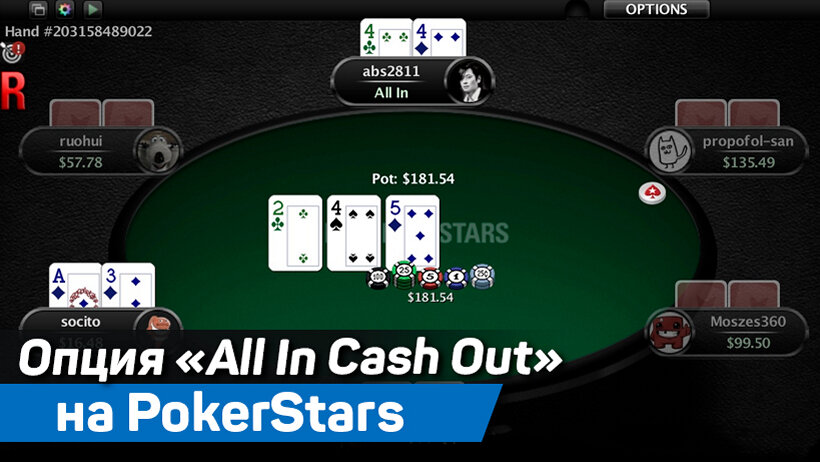 PokerStars подтвердили внедрение функции «All-in Cash Out» за кэш-столами на реальные дeньги. Новая функция будет работать вместе с «Run It Twice» и снизит дисперсию для игроков. Что такое «All-in CashOut» и как работает эта функция, расскажет Pokeroff. «All-in Cashout»: выкупи долю в банке за 1% эквити Внедрение функции «All-In Cash Out» было анонсировано в конце июля, но только теперь стали известны подробности новой фишки. Инновационная и уникальная функция (так её сами окрестили на ПокерСтарс) «All-in Cash Out» в настоящее время доступна только за столами на условные фишки, но в ближайшее время появится и за столами на реальные дeньги. «All-in Cash Out» работает как страховка, позволяющая игрокам продавать своё эквити за реальные дeньги, когда игрок нажимает кнопку «All-in». Каждый раз, когда игрок будет идти олл-ин, будут доступны две опции: «Resume» («Возобновить игру») и «Cash Out». Выбрав опцию «Cash Out», игроки сразу выкупают долю в банке в зависимости от эквити их собст