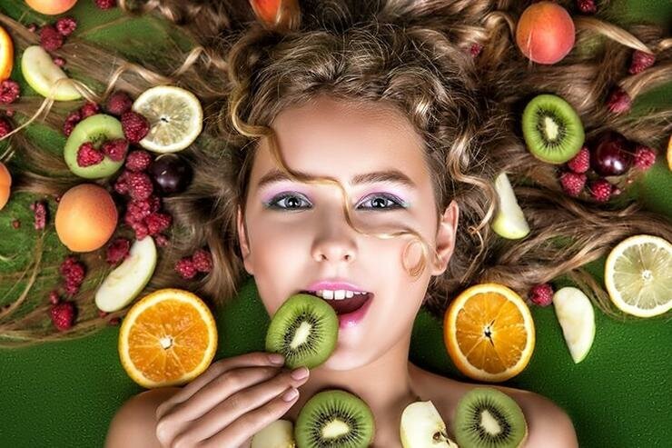 Витамин С - важное составляющее синтеза коллагена. Содержится в: цитрусовых, шиповнике, киви, петрушке.