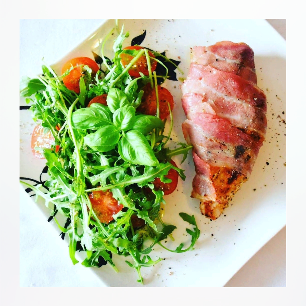 ПОСЛЕДНИЕ МИНУТЫ обед или филе а-ля мумия готов 😂 (немного похоже, верно?) ИНГРЕДИЕНТЫ -2 (маленьких) куриных филе -4 ломтика тонко нарезанного бекона (вы также можете использовать, например, ветчину в вашем холодильнике) -чайная ложка гранулированного чеснока -чайная ложка острого перца -чайная ложка орегано -соль и перец по вкусу -3 столовые ложки оливкового масла (для маринада) + 4 столовые ложки для салата -маленький пакет для запекания -8 маленьких помидоров Приготовление Налейте 3 столовые ложки оливкового масла в миску, добавьте чеснок, перец, орегано и перемешайте. Слить филе с солью и перцем, затем натереть маринадом и дать постоять в течение 15 минут. В течение этого времени установите духовку на 200 ° C. Положите на тарелку порцию рукколы и помидоры, разрезанные пополам. Обжарить филе в течение 2 минут с каждой стороны на сильном огне, затем обернуть каждый беконом / ветчиной и поставить в духовку на 15 минут. Смешайте 4 столовые ложки оливкового масла с солью и перцем