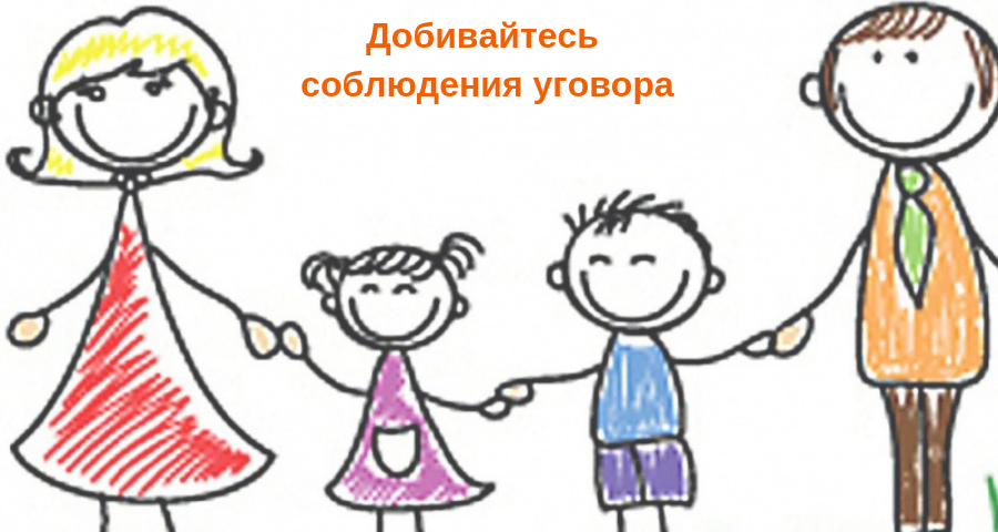 Прочитайте "Новую установку", выраженную в одной-двух фразах, выделенных жирным шрифтом. Перепишите эти фразы на листочки и прикрепите на холодильник. Вы сможете обращаться к новым установкам и черпать в них вдохновение каждый раз, когда возникнет "напряженная" ситуация, связанная с ребенком. Именно они понадобятся вам "в деле". 19 шаг. Добивайтесь соблюдение договора Ситуация : ребенок играет на компьютере, хотя вы просили его закончить. Обычная реакция : ребенок продолжает играть, хотя время вышло, и к тому же он вас не послушался... Соблазн накричать велик. Чувство бессилия часто заставляет нас соразмерять наказание со степенью нашего раздражения, а не с тяжестью проступка. Такое наказание снимает ответственность с ребенка, освобождая его от осознания своей вины. Крики он пропускает мимо ушей, нотации не действуют... Но ведь и смолчать тоже невозможно ! Ваша цель : приучить ребенка думать о других. Ребенок должен уметь оценивать эффект от своих действий . Если вы ничего не предприм