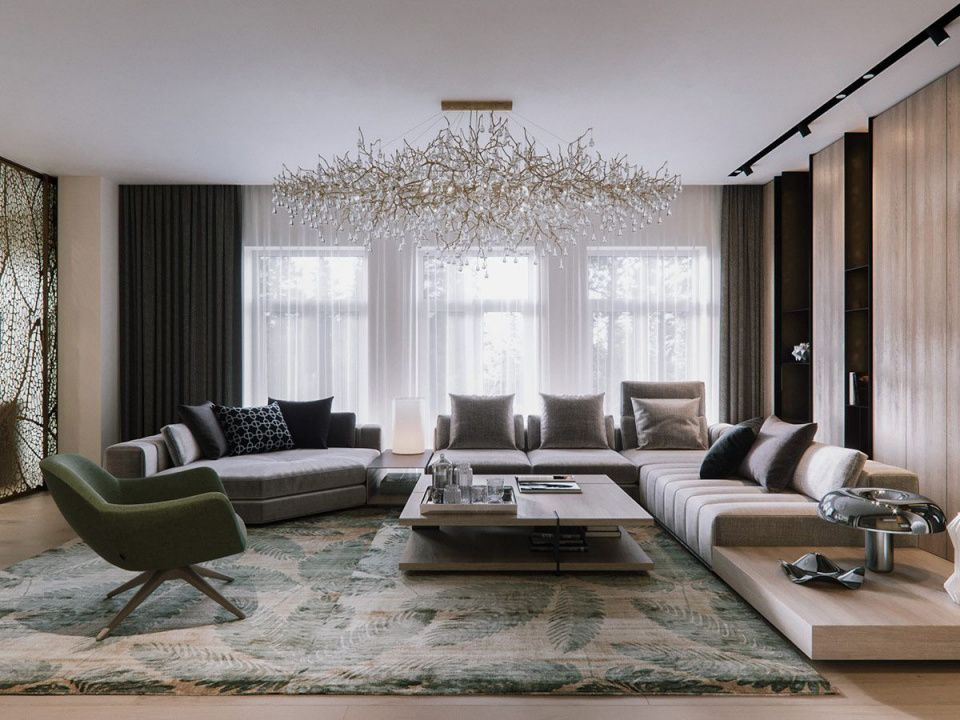 Великолепная люстра с золотистыми ветвями венчает роскошную гостиную. По ее ветвям, как будто стекают замерзшие хрустальные кристаллы. Двери с потрясающей гравировкой отделяют гостиную от столовой, позволяя создать больше интимной уединенности. Золотые гравюры стильно сочетаются с другими природными элементами в этой комнате.