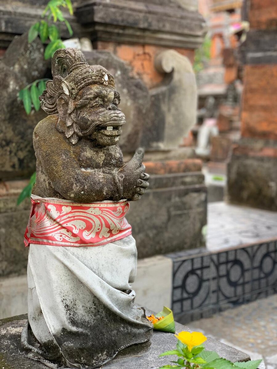 На Бали статуи возле храмов одеты в юбки - саронги. По местным поверьям считается, что ночью они оживают и занимаются делами. В самом деле, не будут же они раздетыми решать важные вопросы!
