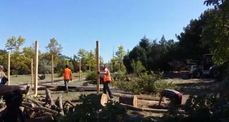 Прямо сейчас в парке «Каменный цветок», расположенном в районе торгового центра «Муссон», идет вырубка деревьев под очередную стройку. Общественники сообщают, что участок зачищают от зеленых насаждений якобы под детское кафе. Видео с места вырубки прислал в редакцию источник «Примечаний». На кадрах хорошо видно, как рабочие пилят здоровые деревья и устанавливают колья для забора вокруг будущей стройки. Подробности происходящего удалось немного прояснить корреспонденту телеканала НТС. Руководивший работами мужчина заявил, что порубочный билет у них есть, однако сам документ предъявить отказался. Позже сотрудники департамента городского хозяйства сообщили, что разрешения на земельные работы у неизвестных нет. На место происшествия оперативно приехал депутат заксобрания Севастополя Вячеслав Горелов, он же вызвал сотрудников Севприроднадзора, а затем и полицию. После того как территорию будущей стройки покинули представители контролирующих органов, работы возобновились. Уверенности в т