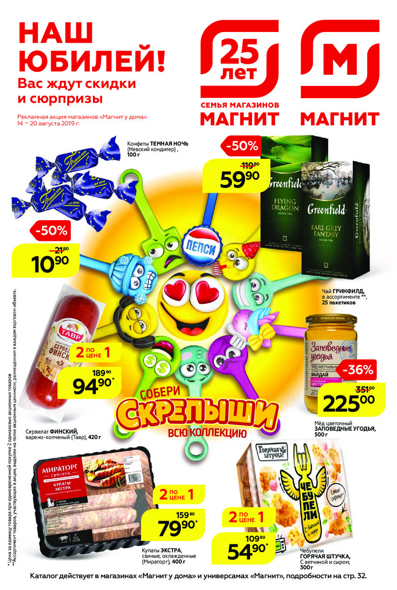 Обзор скидок магазина Магнит с 14 по 20 августа Добрый всем день. Хочу представить обзор свежих акций сети магазинов Магнит. Очень много мясной продукции по акции 2 по цене 1. Причем, есть довольно не плохие продукты. Много акционных товаров в разделе Кофе и чай. А вот некоторые товары из раздела «Замороженные продукты». Очень хотелось еще отметить Икру мойвы с креветками фирмы "Санта Бремор". Икра в меру соленая и в ней и правда попадаются небольшие кусочки креветок. В разделе Гигиена и бытовая химия акции на шампуни Dove, Shauma, Clear, гель для душа Palmolive и порошки Tide и Persil. Также представлен календарь скидок до конца августа. А еще стартовала новая акция на игрушки. Некие «Скрепыши». Это небольшая резиновая штуковина, разных цветов и с разными мордочками, всего около 22 видов. Служит для скрепления шнурков, наушников, различных проводков, также их можно скреплять между собой, создавая браслеты. Выдавать их будут с 14 августа по 13 октября за покупку от 400