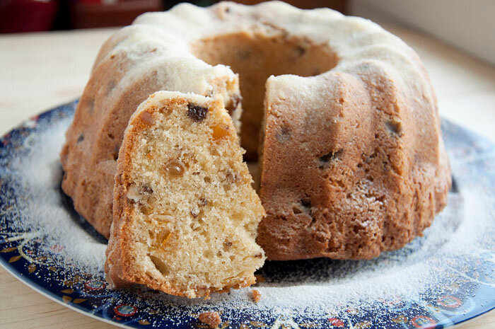 Ингредиенты: 500гр. пшеничной муки, 300гр. сахара, 250гр. масла, 4 яйца, 0,5 стакана молока, 1 пакетик разрыхлителя теста (12гр.), 80 гр. изюма, сахарная пудра для посыпки. Масло растереть с сахаром и яйцами, добавить муку, разрыхлитель теста, ванильный сахар и молоко. Затем добавить изюм. Все хорошо перемешать. Печь в форме для пирога при температуре 200 градусов 60 минут. Приятного аппетита!
