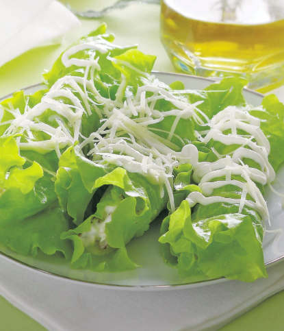 200 г твердого сыра, 1 яблоко, 1 ст. а. грецких орехов, 4 ст. л. сметаны, листья зеленого салата, зелень петрушки и укропа. Сыр и яблоки натереть на крупной терке. Грецкие орехи очистить и измельчить. Все смешать и заправить сметаной (3 ст. л.). Разложить листья салата и закрутить их в трубочки. Трубочки украсить сметаной, посыпать сверху тертым сыром и зеленью.