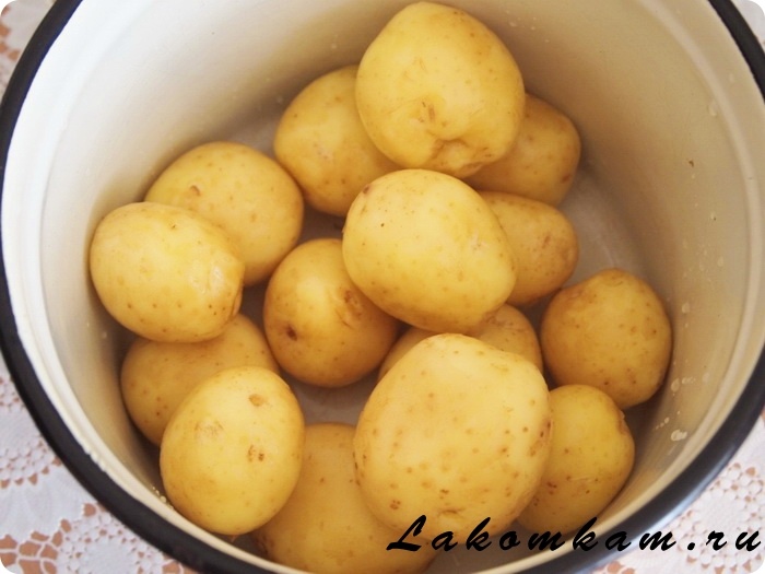 Приготовление молодого картофеля с чесноком. Молодой картофель промываем в воде, соскабливаем кожуру и окончательно промываем. Складываем в кастрюлю и варим до полной готовности. В процессе варки картофель не солим.