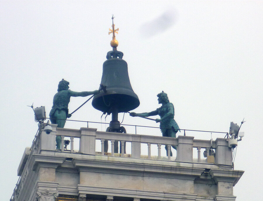 Башня с часами видна, как только подплываешь к берегу со стороны Венецианской лагуны. На ее плоской крыше-террасе установлен колокол. С двух сторон по нему бьют молотами два гигантских пастуха, тела которых прикрыты звериными шкурами. Чтобы показать связь поколений и быстротечность времени, одного из них скульптор сделал стариком, а другого юношей.