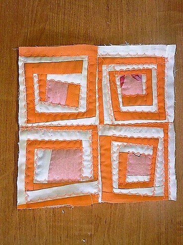 Этот вариант тоже не новый, просто выполнен в других цветах и чуть изменен а центральная фигура. Все выполняется все в той же технике Крези. Для центра беру квадрат, цвет квадрата немного отличается от цвета полосок. Обшиваю квадрат полосками или лоскутами треугольной формы по часовой стрелке или против часовой стрелки. Полоски можно подрезать и придать им форму трапеции. Чередую розовые и белые полоски. Когда размер сшитого блока уже достаточный С помощью картонного трафарета выкраиваю квадрат нужного размера. Для блока сшила четыре квадрата. Сшиваю квадраты в блок. Не ругайте меня сразу, у меня белая ткан ни как не захотела ложиться, и утюжка не помогла. Все спасла стежкой. Сколола три слоя, синтепон, подкладку и блок Сделала стежку по линиям швов квадратов и по линиям швов полосок. Вот такой блок получился. Изнаночная сторона. Вот такой блок получился.