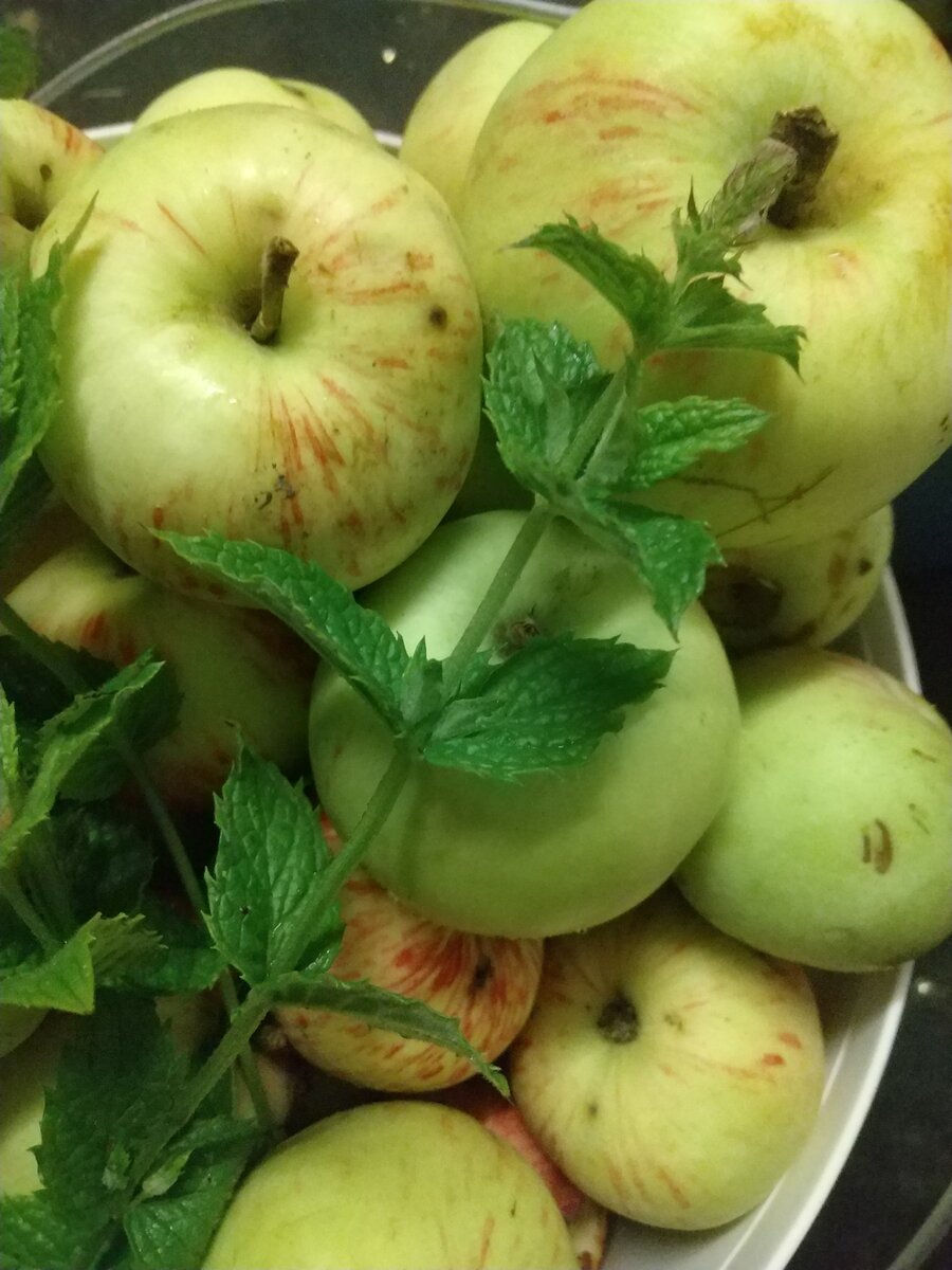 Яблок в этом году очень много. А я стараюсь, чтобы ничего не пропало, вот и решила компотов наделать. Правда, сын попросил ещё яблочного варенья, но это потом. Итак, компот. Яблоки - падалица, с дерева пока не снимали, да и крупные они, поэтому режу дольками. Объём - на три трёхлитровых банки. Нарезала в ведро с водой, чтобы не потеряли свой светлый цвет. Простерилизовала банки, поставила кипятить воду, в банки засунула плотно яблоки. Сверху положила в каждую банку по 3 листика мяты. Залила яблоки кипятком, дала постоять 10 минут, вылила воду обратно в кастрюлю и снова кипятить. В воду добавила 2 стакана сахара (1 стакан 250 мл на трёхлитровую банку) и лимонную кислоту на кончике ножа. Когда будущий сироп закипел, убавила газ и дала лениво побулькать 15 минут. Залила банки, закатала стерилизованные крышками, перевернула и убрала под шубу до остывания. Мята даёт нежные нотки к яблочному вкусу, и компот получается поистине необычным. А если кому рецепт показался сложным, то есть у меня