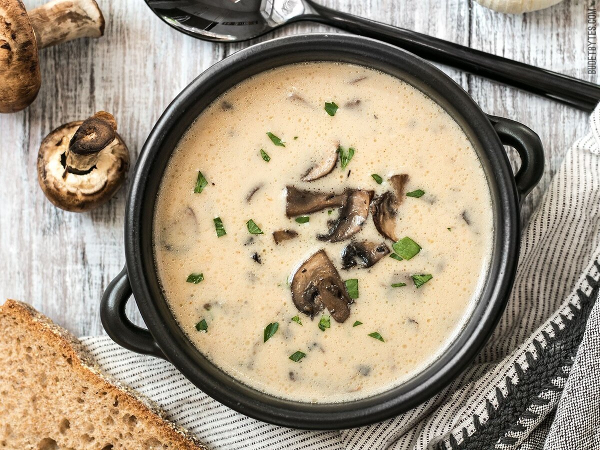 Крем-суп — вкусное первое блюдо с приятной консистенцией. Правильно приготовленный, он отличается насыщенным сливочным вкусом и имеет шелковистую однородную структуру. Настоящий крем-суп никогда не готовится на обычном бульоне, а тем более на воде. Его варят исключительно на облегченном соусе бешамель, молоке или на бульоне, загущенном обжаренной мукой и доведенном до кипения льезоном — смесью жирных сливок и свежих яичных желтков. Особенно вкусными супы получаются из обжаренных с луком шампиньонов, куриного филе или картофеля с кусочками бекона. Секрет правильного приготовления — в своевременном добавлении жирных сливок: в самом конце процесса готовки. Ингредиенты: Шампиньоны — 250 Грамм Сливки — 3 Ст. ложки Вода или бульон — 250 Миллилитров Картофель — 2-3 Штук Лук репчатый — 1 Штука Чеснок — 3 Зубчика Паприка — 0,5 Чайных ложки Соль — 0,5 Чайных ложки Лук зеленый — 1-2 Штук Растительное масло — 2 Ст. ложки Пошаговое описание процесса приготовления: 1. Подготов