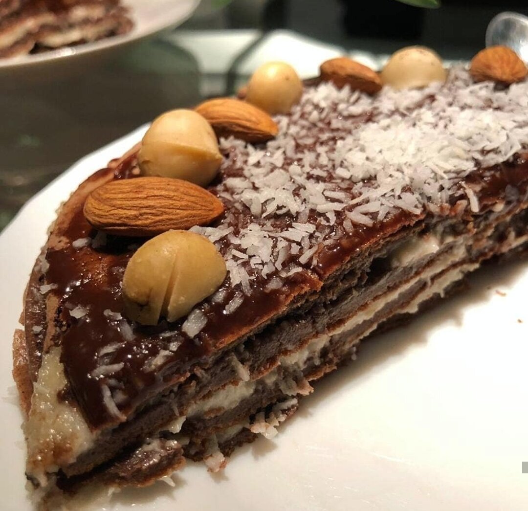Если Вы на диете, или просто боитесь есть сладости, чтобы не поправиться - этот рецепт Вам жизненно необходим. =)Вкусно, быстро, и главное полезно, в 2 раза меньше ккал, чем в обычном тортике.Тортик состоит из блинчиков смазанных кремом. Что нам необходимо на блины? Из этого у меня получается 5-6 блинов. Смешиваем и на сковороду. Желательно с антипригарным покрытием, чтобы не использовать растительное масло. Это сэкономит вам калории, так как масло ооочень калорийно. Что нам необходимо на крем? - 50 г кешью. (можно и без орехов вообще) - 20 г кокосовой стружки - 30 мл кокосового молока, или обычного молока, или воды. - банан 1-2 штуки. (прослойка между блинами) Все взбить, подсластить по вкусу. Кто озабочен пп, подсластить стевией или эритритом, кто нет - можно и сахар). Ну и все. Смазываем блины, выкладываем между слоями банан, сверху посыпаем орехи. Приятного аппетита!