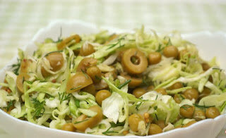 Приготовим по этому рецепту простой салат с оливками. Очень лёгкий и вкусный салат, не сложный в приготовлении. Ингредиенты: Капуста молодая - 500 г. Оливки зеленые - 1 банка (300г.) Горошек зеленый - 1 банка (400г) Укроп 1 пучок Соль Горчица зеленая - 2 ст.л. Мёд - 1 ч.л. Масло растительное нерафинированное - 3 ст.л. Лимонный сок - 2 ст.л. Перец черный молотый - 1/2 ч.л. Пошаговое приготовление: 1. Мелко шинкуем полкилограмма молодой капусты. 2. Одну банку зеленых оливок без косточки нарезам колечками. 3. Мелко режем небольшой пучок укропа. 4. В миску кладем нашинкованную капусту, нарезанные оливки, банку консервированного горошка и порезанный укроп. 5.Делаем заправку для салата: в миске смешиваем пол. чайной ложки соли, 2 чайной ложки горчицы с зернами(её можно заменить обычной горчицей), 1 чайную ложку меда, 2-3 нерафинированного растительного масла, 1-2 ст.л. лимонного сока и черный молотый перец. Всё хорошо перемешиваем. 6. Приготовленной заправкой заправляем салат и всё хорошо пе
